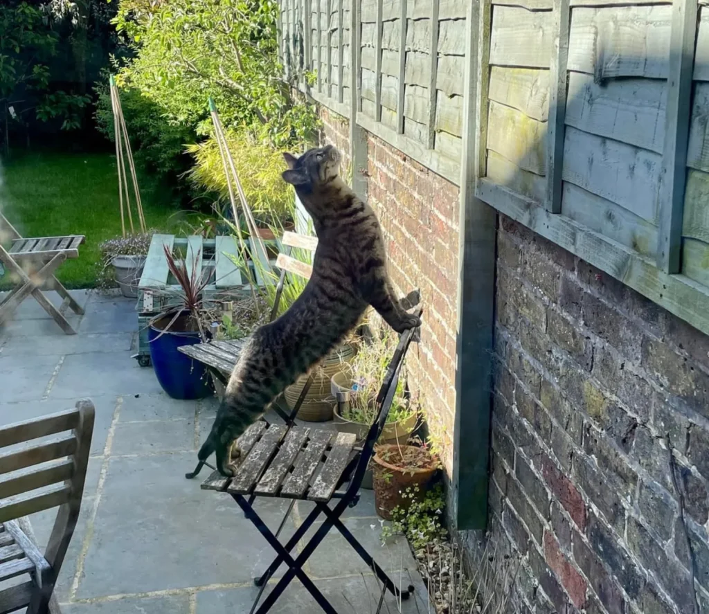 In a quiet corner of a sun drenched garden, a striped explorer stretches tall on a wooden chair, eyes fixed on the top of a fence. The world beyond beckons with mystery, and the little climber’s stance is one of ambition. Leaves rustle, birds chirp, and the air hums with possibility. This is where the journey begins with curiosity as the compass.