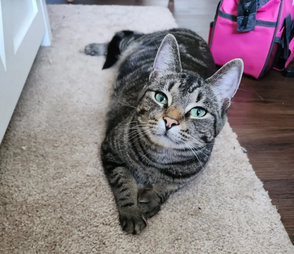 Further proof of his high status is seen on the carpet. He is documented lying down with his front paws politely crossed, looking up like a sophisticated gentleman waiting for an important meeting to begin probably to discuss the tardiness of his dinner service. In other moments, he executes a geometrically perfect loaf, his eyes wide and alert, acting as the watchful security system for the household. This is a cat who means business.