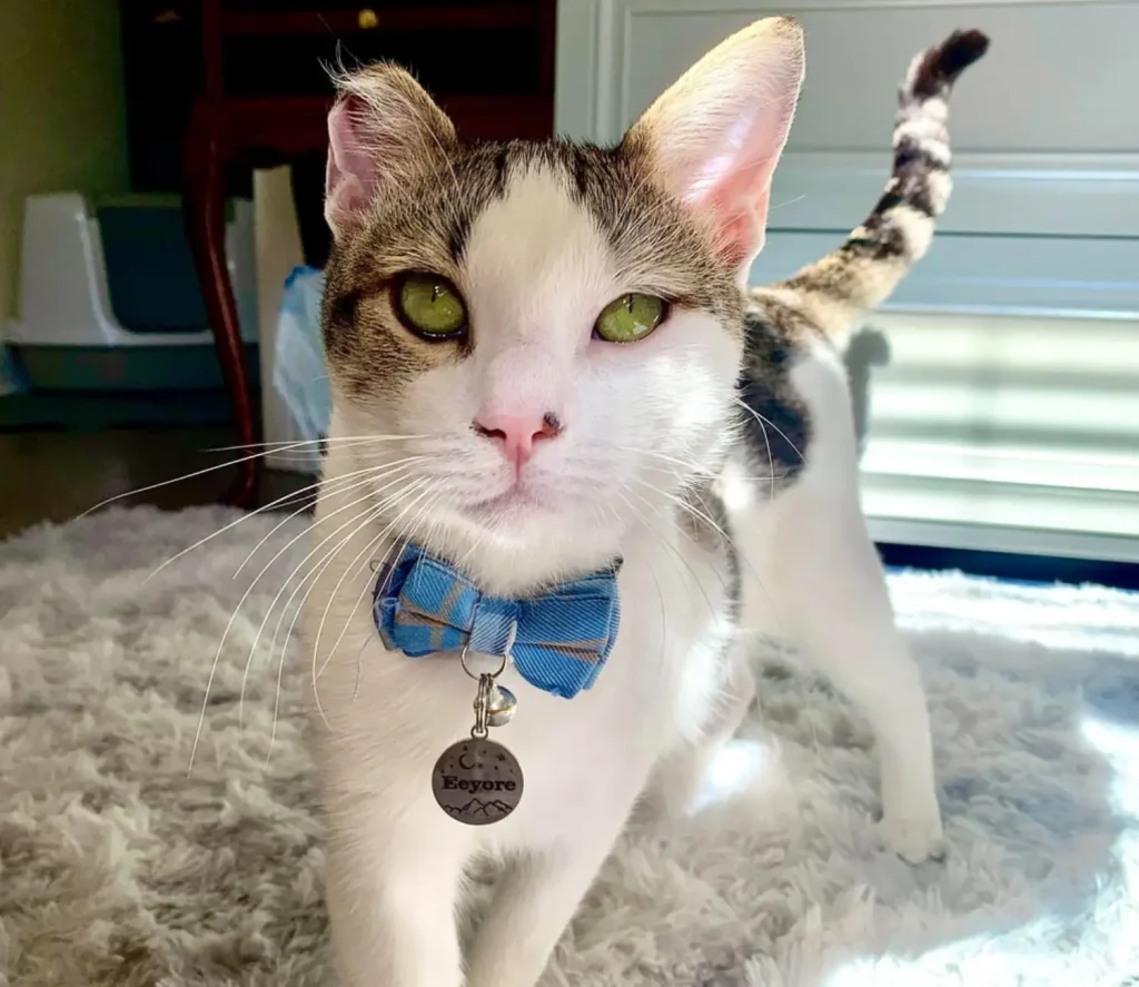 Every household has a ruler, and in this particular home, the undisputed sovereign is a white and tabby feline with striking green eyes and a nose the color of bubblegum pink. His name, according to the customized tags he wears with such dignity, is Eeyore.