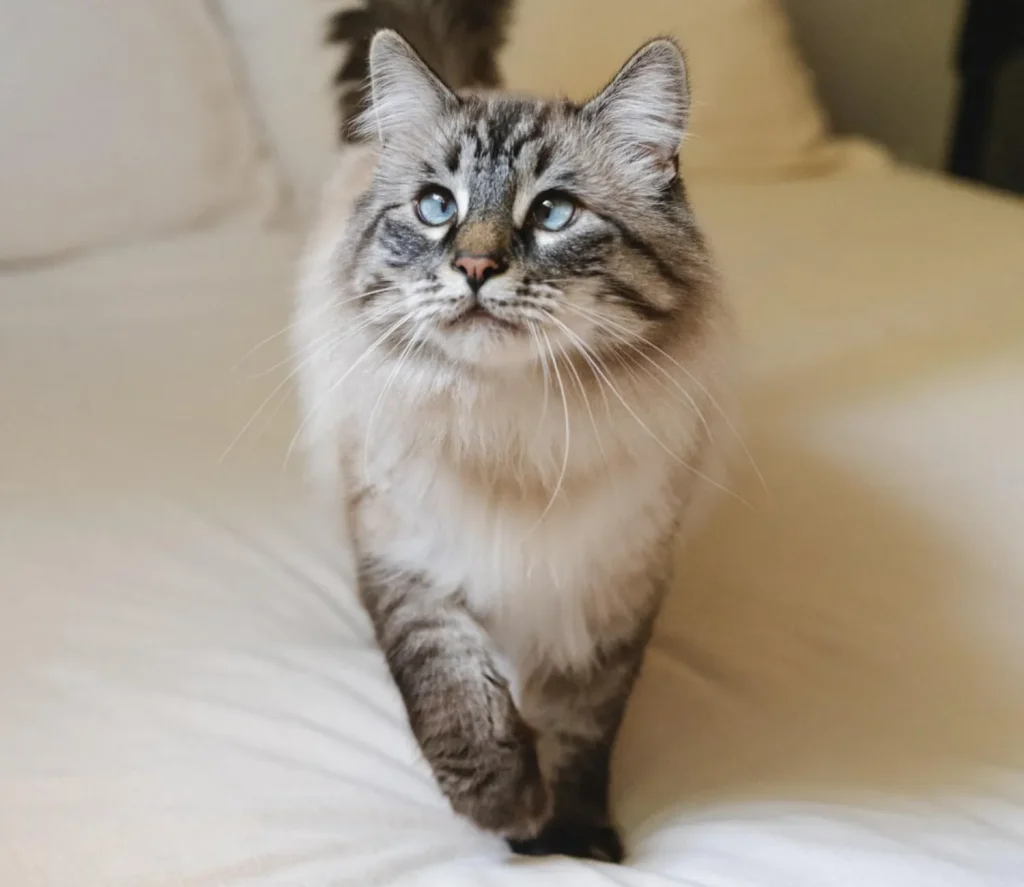 In a quiet home nestled between soft morning light and the scent of fresh linen, a regal feline named Miso began her daily patrol. Her fur shimmered with silvery stripes, and her blue eyes scanned the room with practiced precision. Each step across the bed was deliberate, her tail held high like a banner of pride. Miso wasn’t just exploring she was inspecting her realm, ensuring every pillow was in place and every corner free of intruders. Her presence brought a sense of calm, a reminder that elegance could be found in the smallest of routines.